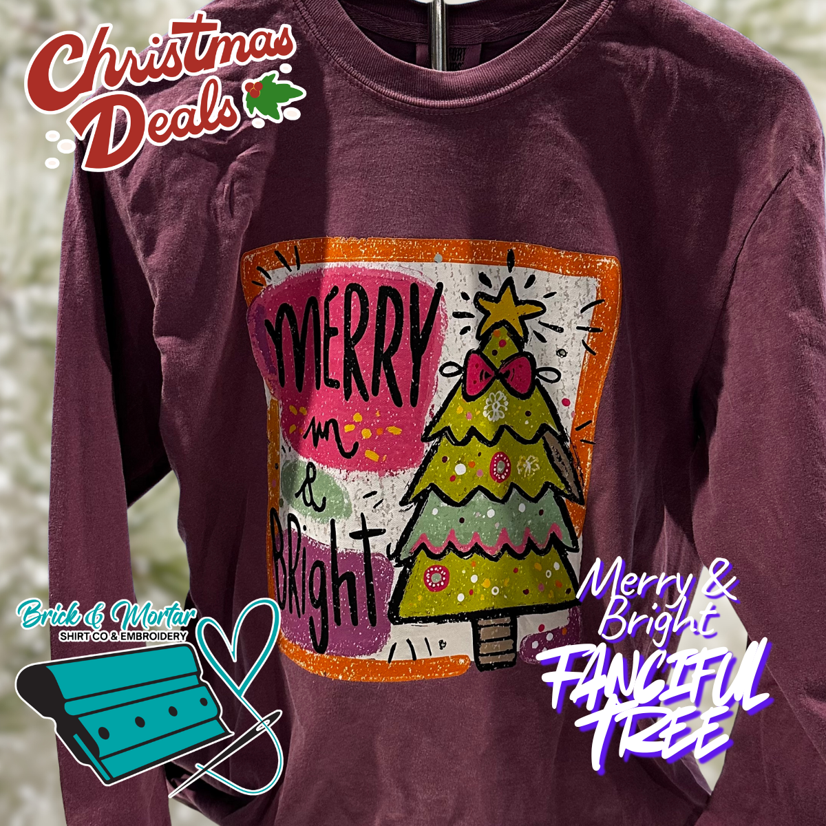 Celebrate the season with the Merry & Bright Fanciful Tree crewneck long sleeve t-shirt. Featuring whimsical colors and sketch-style festive markings, this shirt brings playful cheer to your holiday wardrobe. Its comfortable fit and bright design make it perfect for spreading joy all season long.