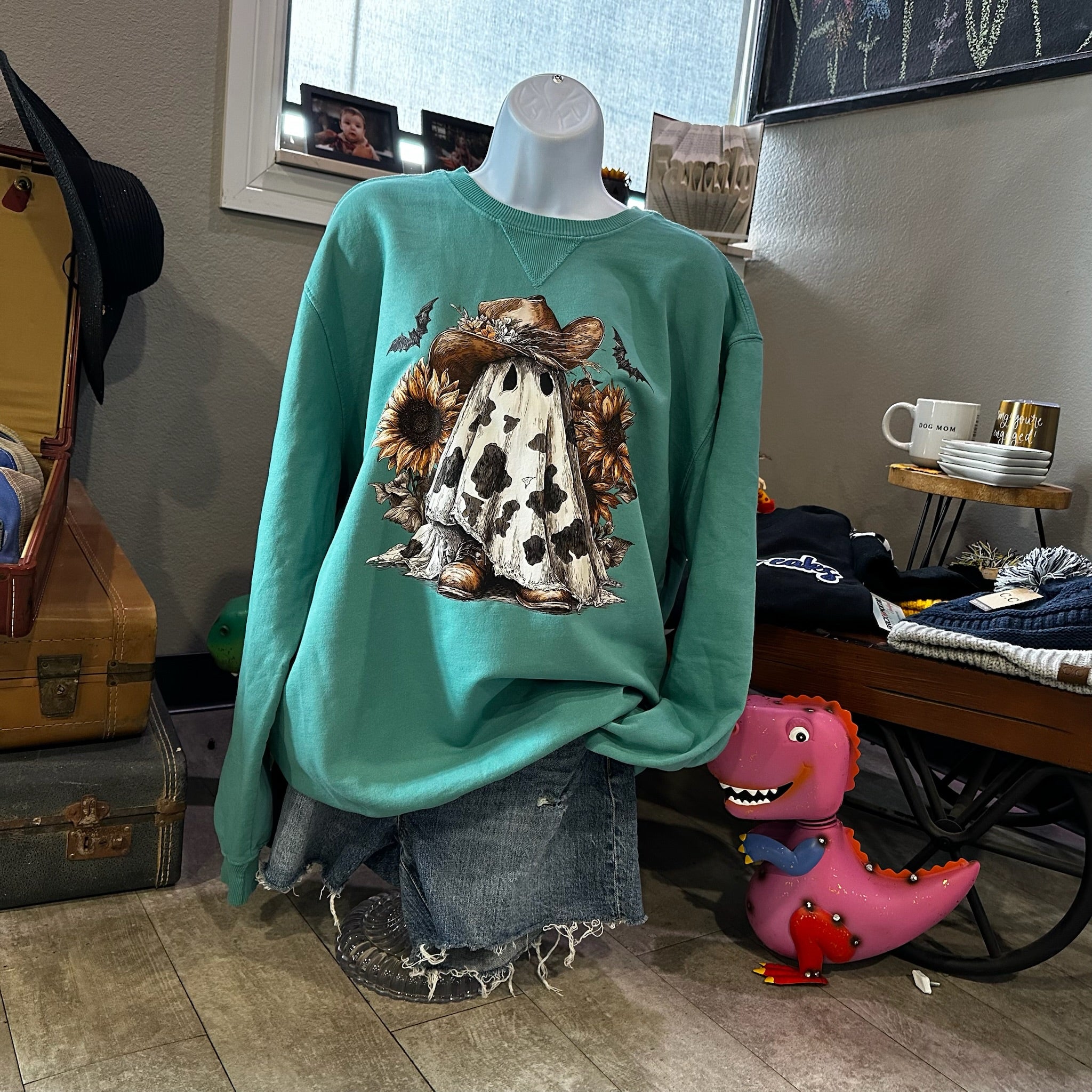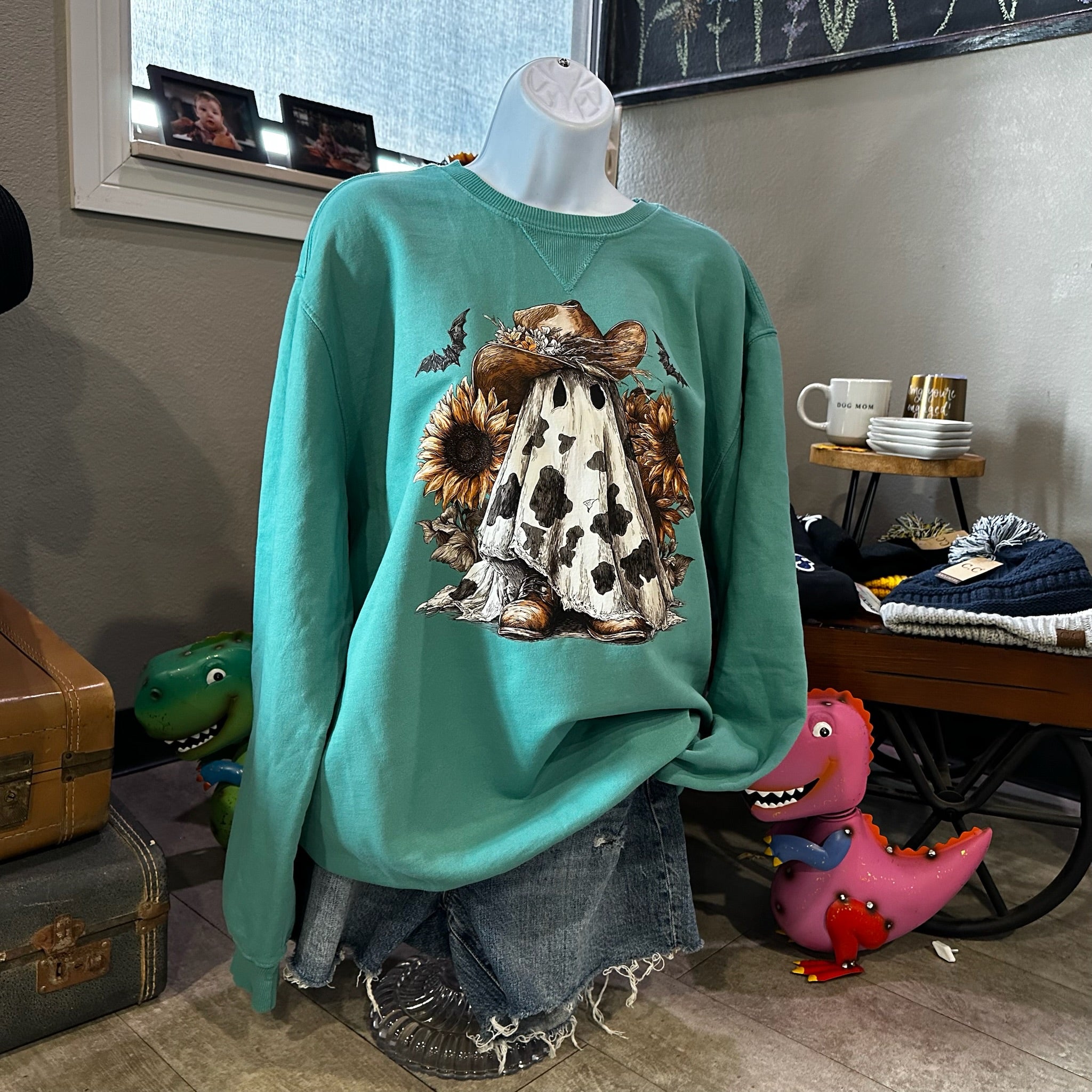 An adorable Holstein cow ghost decked out in a cowboy hat and boots, surrounded by bold sunflowers on the most eye-catching crewneck.
