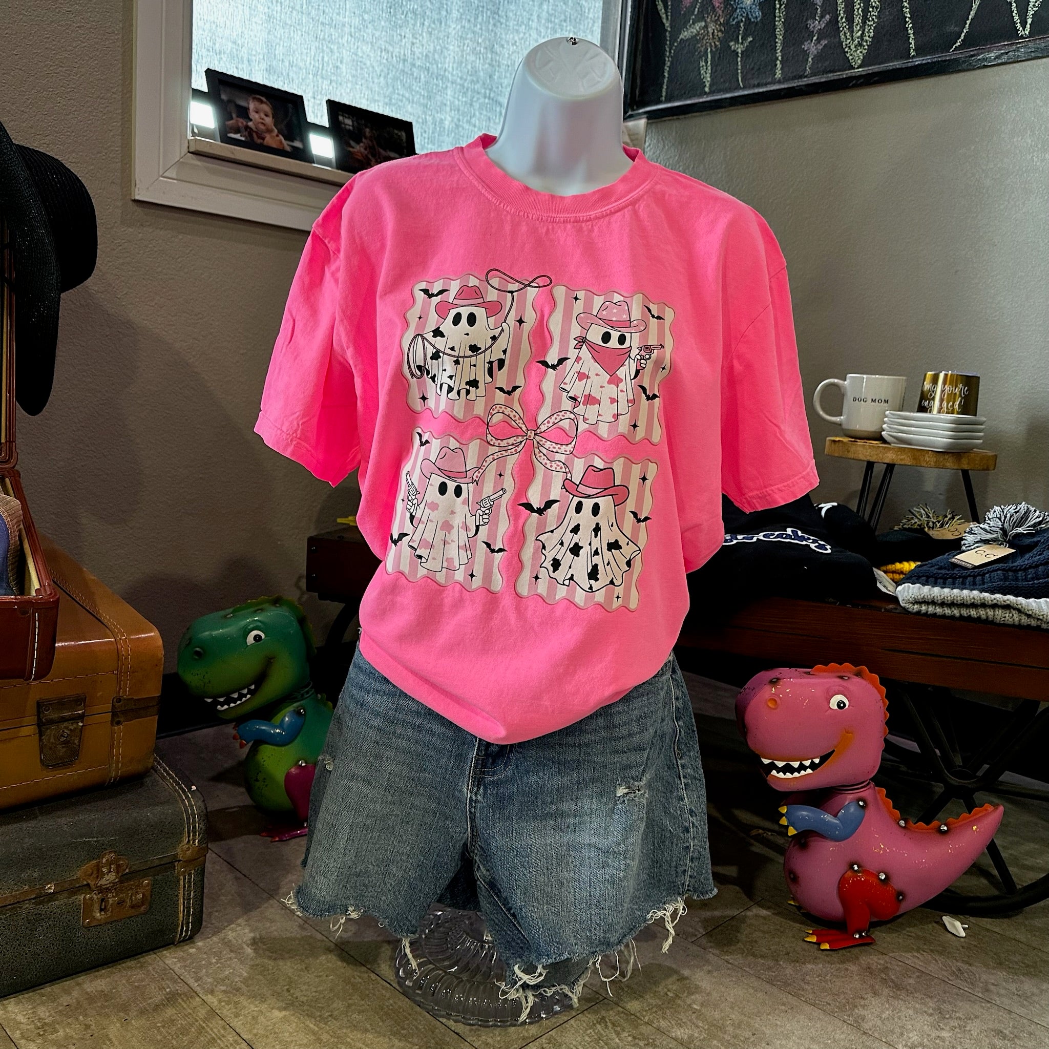 Celebrate fall and Halloween with the Ghostly Personalities shirt, featuring the cutest cowgirl ghosts and charming bow details for a fun, playful look.