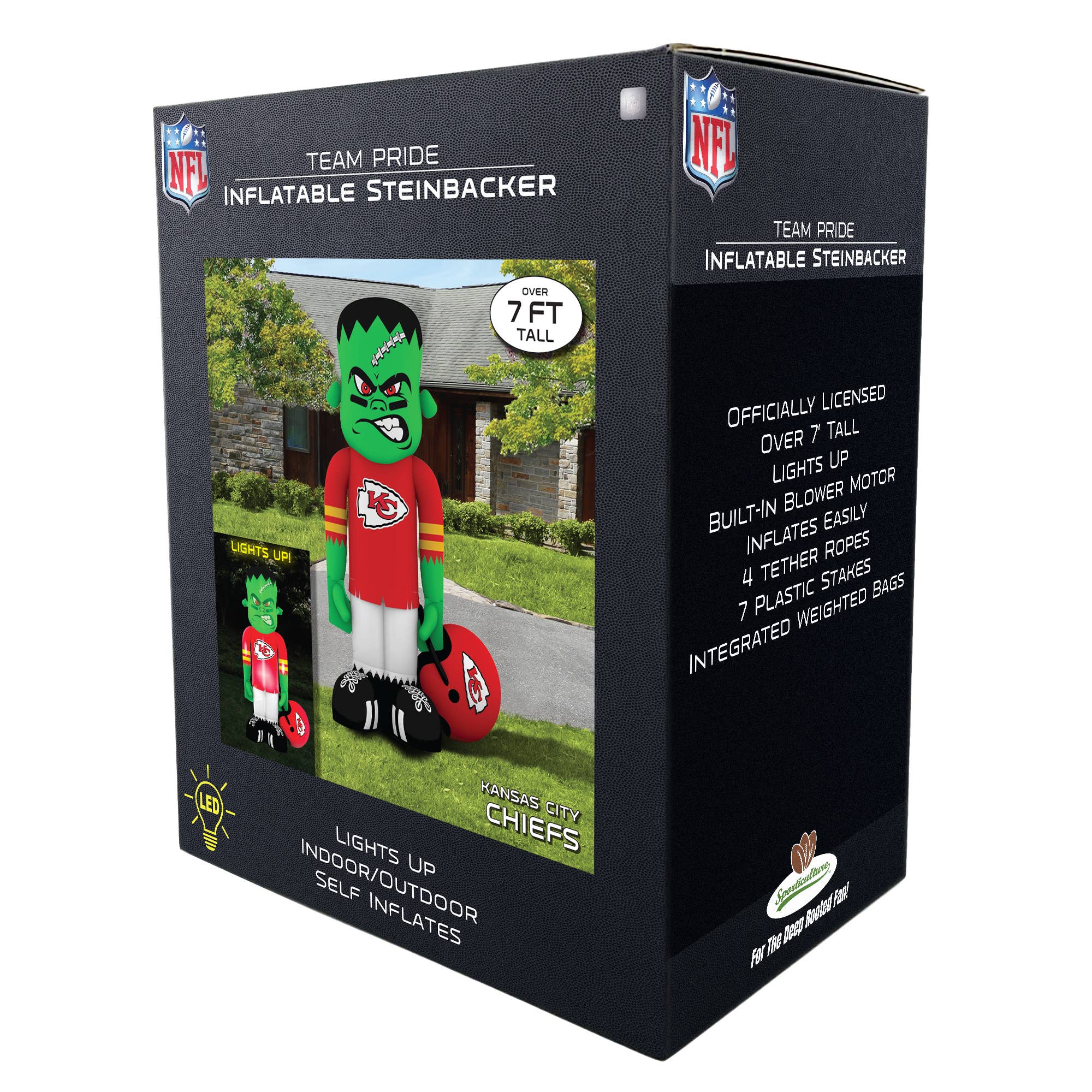 Prepare for game day excitement with the Kansas City Chiefs Inflatable Frankenstein-backer! Standing 7’8” tall, this giant football player sports your favorite team’s gear and is ready to dazzle and daunt. Fully licensed, it features easy self-inflation, glowing LED lights, and folds down for quick storage. Includes a built-in blower, bright LEDs, tether ropes, and ground stakes. Made from tough, weatherproof material, it’s the ultimate touchdown for your yard or tailgate party décor.