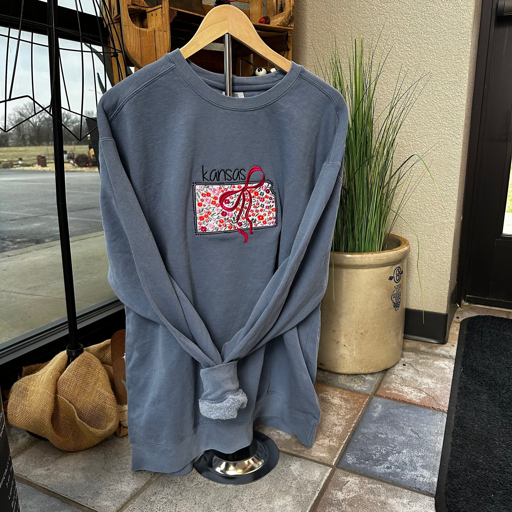 Celebrate your Kansas pride with this beautifully embroidered crewneck sweatshirt. Featuring delicate wildflowers and an elegant bow design, it's a thoughtful way to show your connection to home. The soft, comfortable fit makes it perfect for everyday wear, whether you're cheering on your community or simply expressing what matters to you. This piece supports your style while honoring the natural beauty of the Sunflower State—a wardrobe staple that feels as good as it looks.