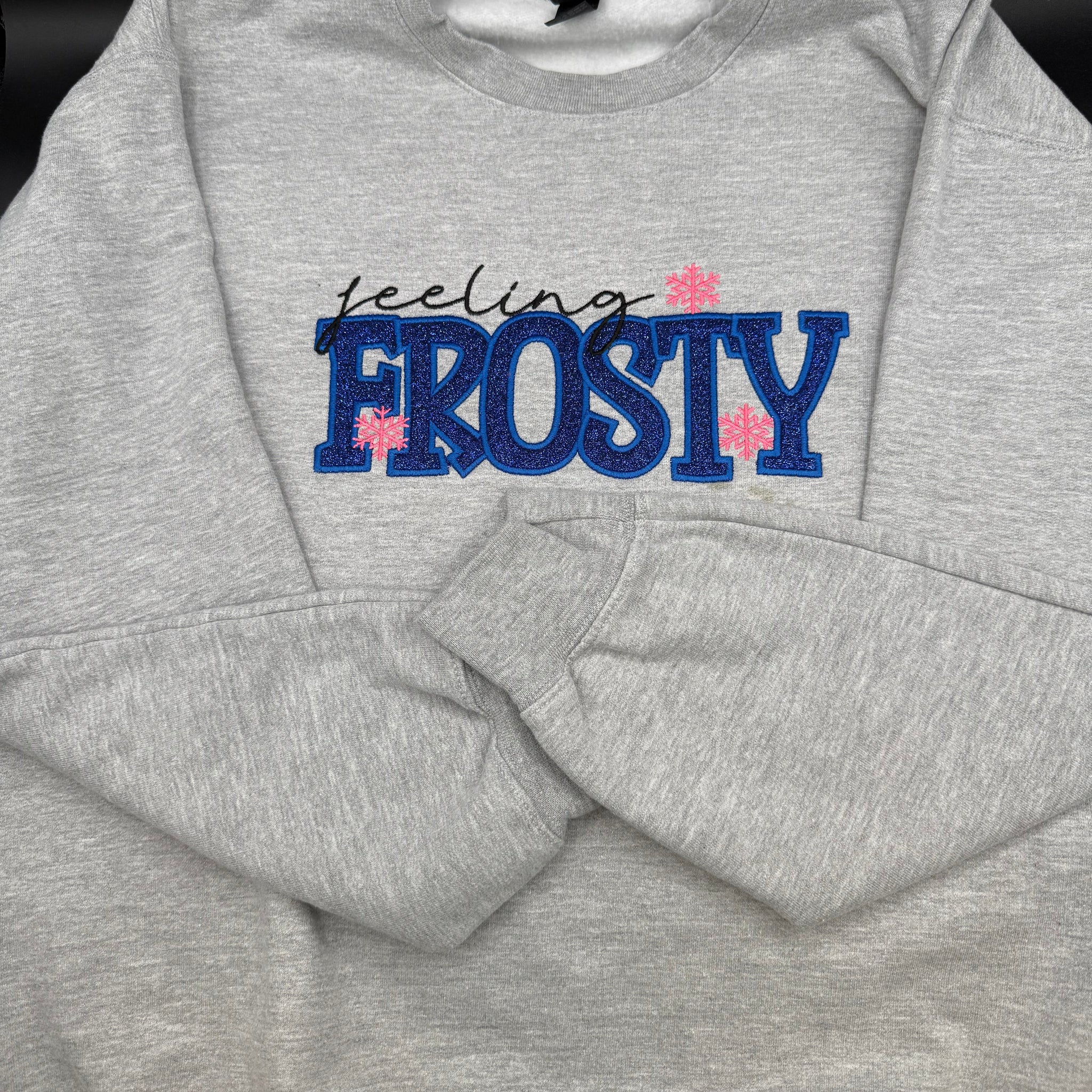 Embrace the season with this playful crewneck featuring a shimmering glitter appliqué that catches the light with every move. The "feeling FROSTY" design brings a fun, festive vibe perfect for holiday gatherings, cozy nights in, or whenever you want to spread winter cheer. Soft and comfortable, this crewneck pairs effortlessly with your favorite jeans or leggings for an instant style upgrade that sparkles with personality.